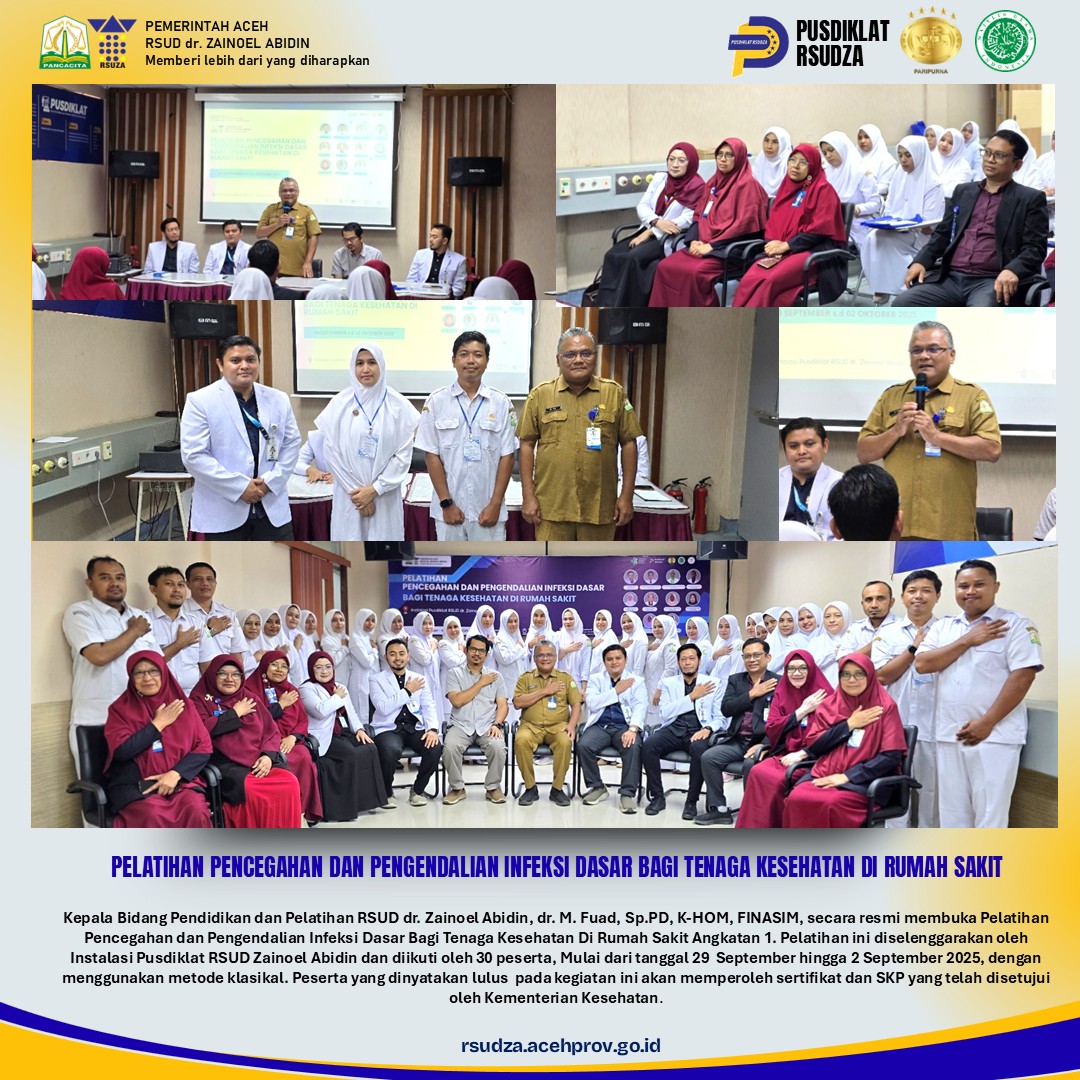 Banda Aceh – Rumah Sakit Umum Daerah dr. Zainoel Abidin (RSUDZA) melalui Instalasi Pusat Pendidikan dan Pelatihan (Pusdiklat) resmi menyelenggarakan Pelatihan Pencegahan dan Pengendalian Infeksi (PPI) Dasar bagi tenaga kesehatan, Angkatan I. Acara ini dibuka secara langsung oleh Kepala Bidang Pendidikan dan Pelatihan RSUDZA, dr. M. Fuad Sp.PD., K-HOM, FINASM, pada Senin (29/9/2025).