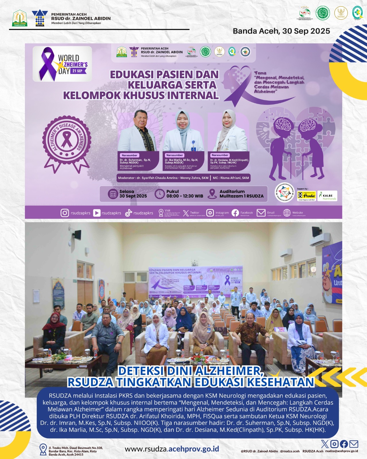 Banda Aceh, 30 September 2025 – Dalam rangka memperingati Hari Alzheimer Sedunia yang jatuh setiap 21 September, Rumah Sakit Umum Daerah dr. Zainoel Abidin (RSUDZA) menyelenggarakan Edukasi Pasien, Keluarga, dan Kelompok Khusus Internal dengan tema “Mengenal, Mendeteksi, dan Mencegah: Langkah Cerdas Melawan Alzheimer”.
