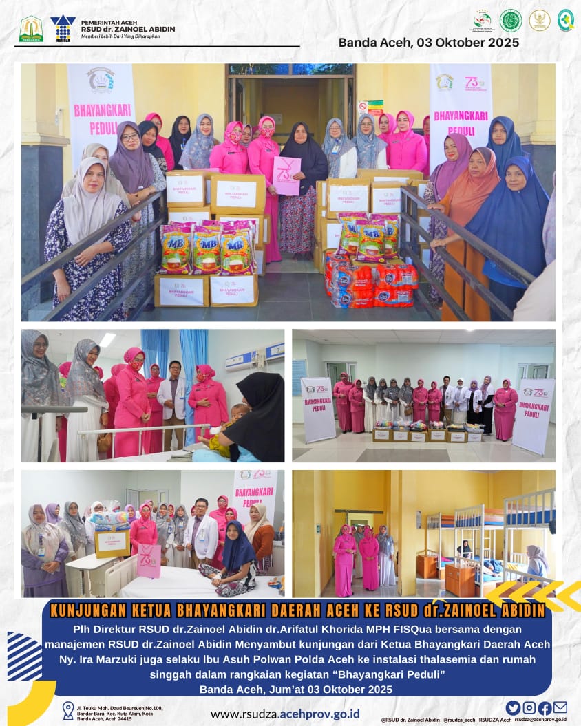 Banda Aceh, 3 Oktober 2025 - Suasana hangat penuh haru menyelimuti Gedung Pusat Pelayanan Onkologi RSUD dr. Zainoel Abidin (RSUDZA) saat Ketua Bhayangkari Daerah Aceh, Ny. Irawati Marzuki bersama rombongan Bhayangkari mengunjungi pasien Thalasemia dan Kanker Darah dalam rangka kegiatan sosial “Bhayangkari Peduli.” Kunjungan ini diterima langsung oleh Plh. Direktur RSUDZA, dr. Arifatul Khorida beserta jajaran manajemen rumah sakit.