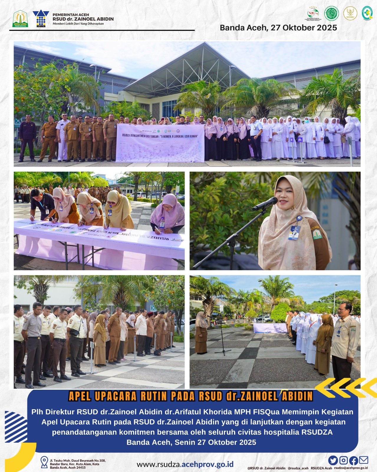 Kegiatan diawali di lapangan apel, diikuti oleh seluruh civitas RSUDZA manajemen, dokter, perawat, hingga staf administrasi. Acara dibuka dengan sambutan hangat dari Plh Direktur RSUDZA, dr. Arifatul Khorida, MPH, FISQua, yang menegaskan komitmen manajemen dalam mendukung budaya kebersihan tangan. Dilanjutkan dengan penandatanganan spanduk komitmen Hand Hygiene oleh seluruh peserta apel pagi, momen ini menjadi simbol semangat bersama untuk menjadikan kebersihan tangan sebagai bagian tak terpisahkan dari pelayanan dan aktivitas harian.