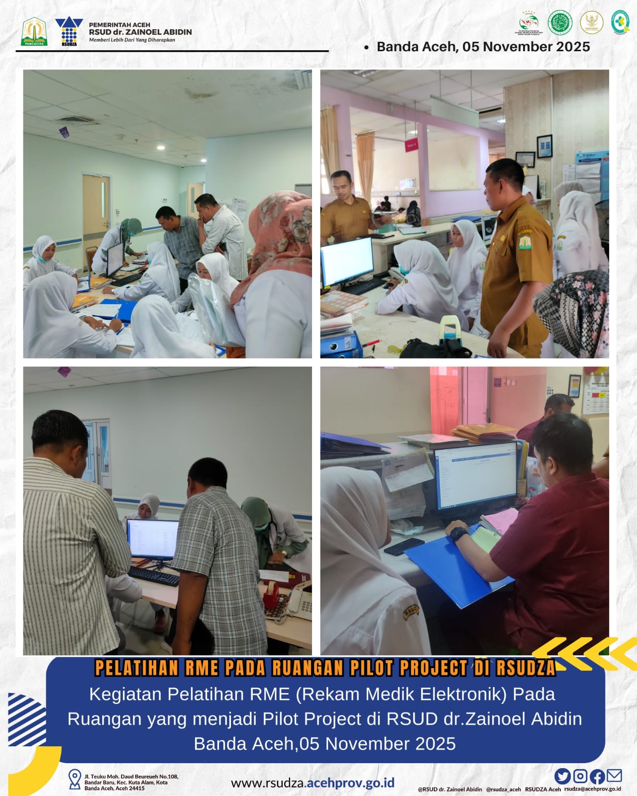 Agar digitalisasi berjalan optimal, RSUDZA melaksanakan berbagai pelatihan kepada tim IT, tenaga medis di unit percontohan rawat inap, serta tim rekam medis sebagai pengguna utama. Pelatihan ini bertujuan meningkatkan literasi digital dan memastikan pemanfaatan RME berjalan konsisten serta efektif di seluruh lingkungan rumah sakit.